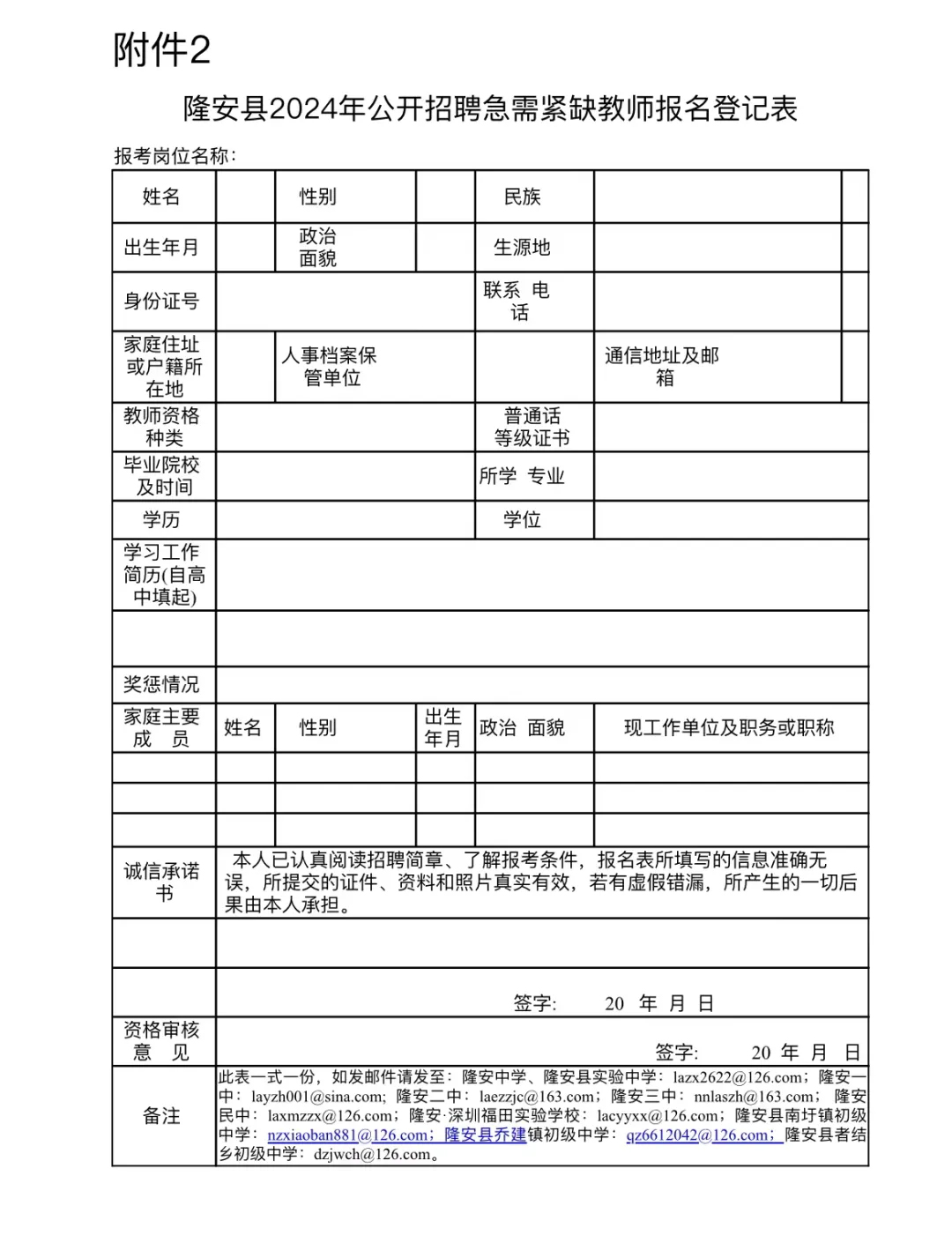 (1)“隆安縣2024年公開招聘急需緊缺教師報名登記表”電子版。可登錄廣西南寧市人力資源和社會保障局網(wǎng)站、廣西南寧市隆安縣人民政府門戶網(wǎng)站、隆安縣民族中學微信公眾號下載。