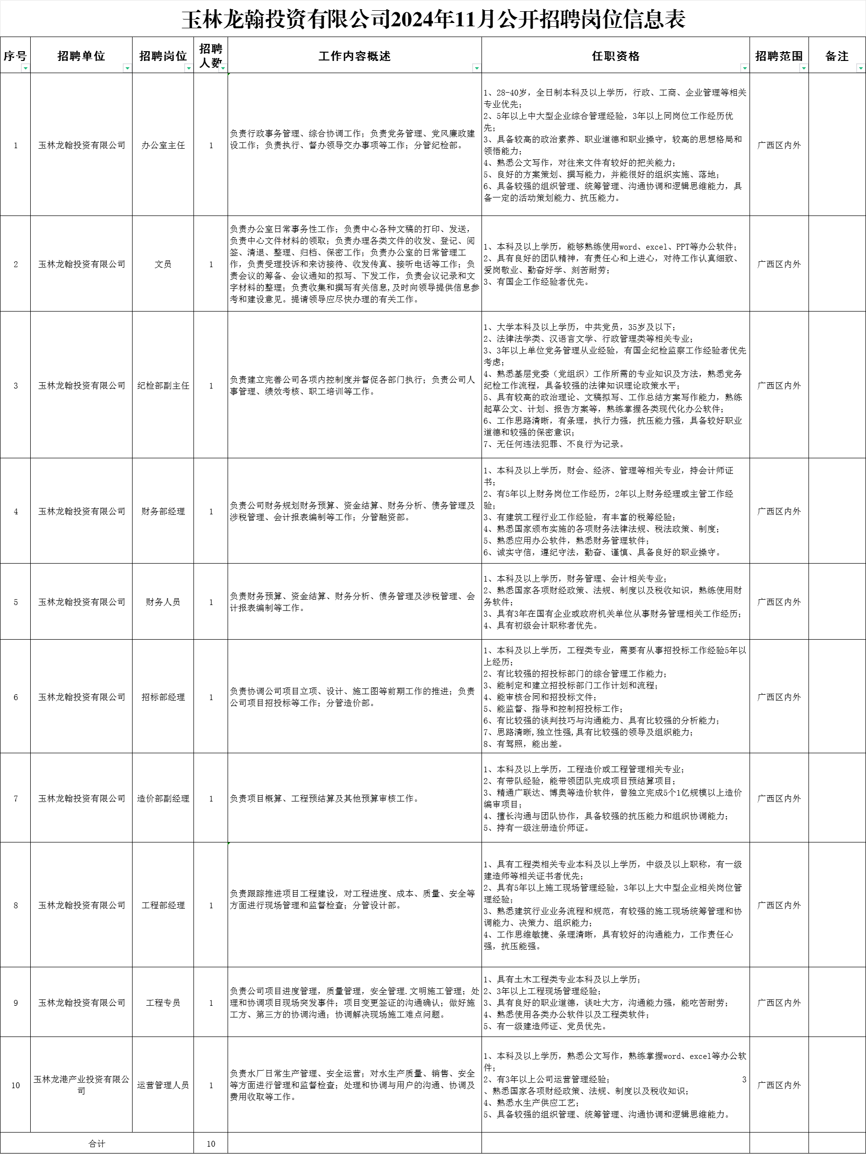 本次面向社會招聘公司各崗位人員10名,詳見附件1。