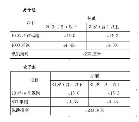 體能測(cè)評(píng)項(xiàng)目中,縱跳摸高的測(cè)評(píng)次數(shù)不超過3次,往返跑的測(cè)評(píng)次數(shù)不超過2次,長跑測(cè)評(píng)次數(shù)為1次。體能測(cè)評(píng)結(jié)果當(dāng)天公布。具體測(cè)評(píng)實(shí)施規(guī)則見《公安機(jī)關(guān)錄用人民警察體能測(cè)評(píng)實(shí)施規(guī)則》(附件3)。