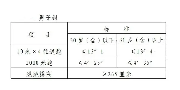 1.測試項目。①長跑(男子1000米跑),②10米×4往返跑,③縱跳摸高。體能測試計分數(shù),滿分為100分,評分標準附后。