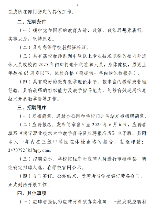 2025年廣西南寧職業(yè)技術(shù)大學(xué)招聘校級教學(xué)督導(dǎo)員2人