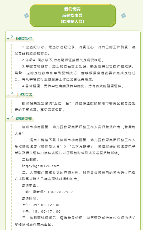 柳州市柳南區(qū)第二幼兒園教育集團后勤工作人員招聘公告