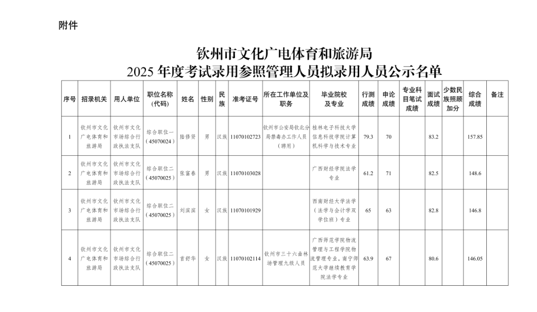 附件:欽州市文化廣電體育和旅游局2025年度考試錄用參照管理人員擬錄用人員公示名單