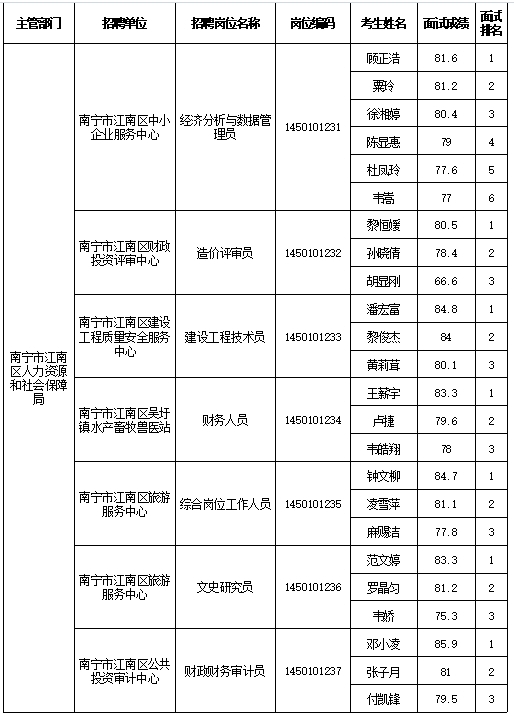 南寧市江南區(qū)人力資源和社會(huì)保障局2025年公開(kāi)考試招聘事業(yè)單位工作人員面試成績(jī)表