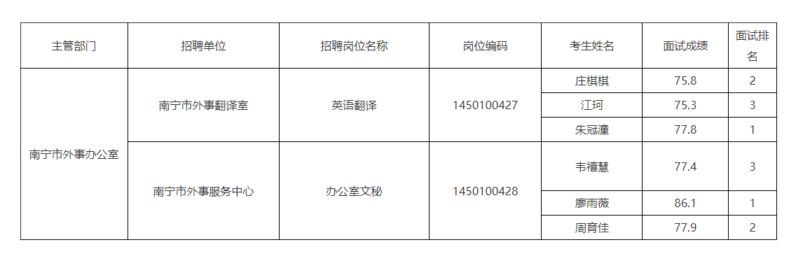 南寧市外事辦公室2025年公開考試招聘事業(yè)單位工作人員面試成績表