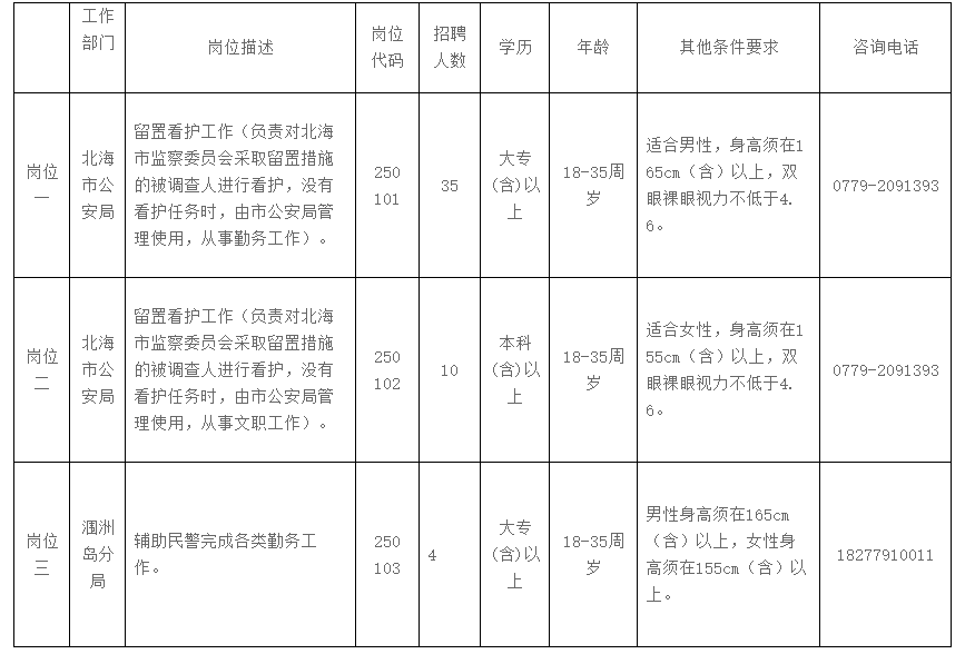 有關(guān)招聘信息,應(yīng)聘人員可登錄北海市人才網(wǎng)(www.bhrc.cn)、北海市公安局微信公眾號(hào)“北海公安”查詢(xún)。咨詢(xún)報(bào)考崗位、資格條件等信息,可在工作時(shí)間內(nèi)致電各崗位咨詢(xún)電話。