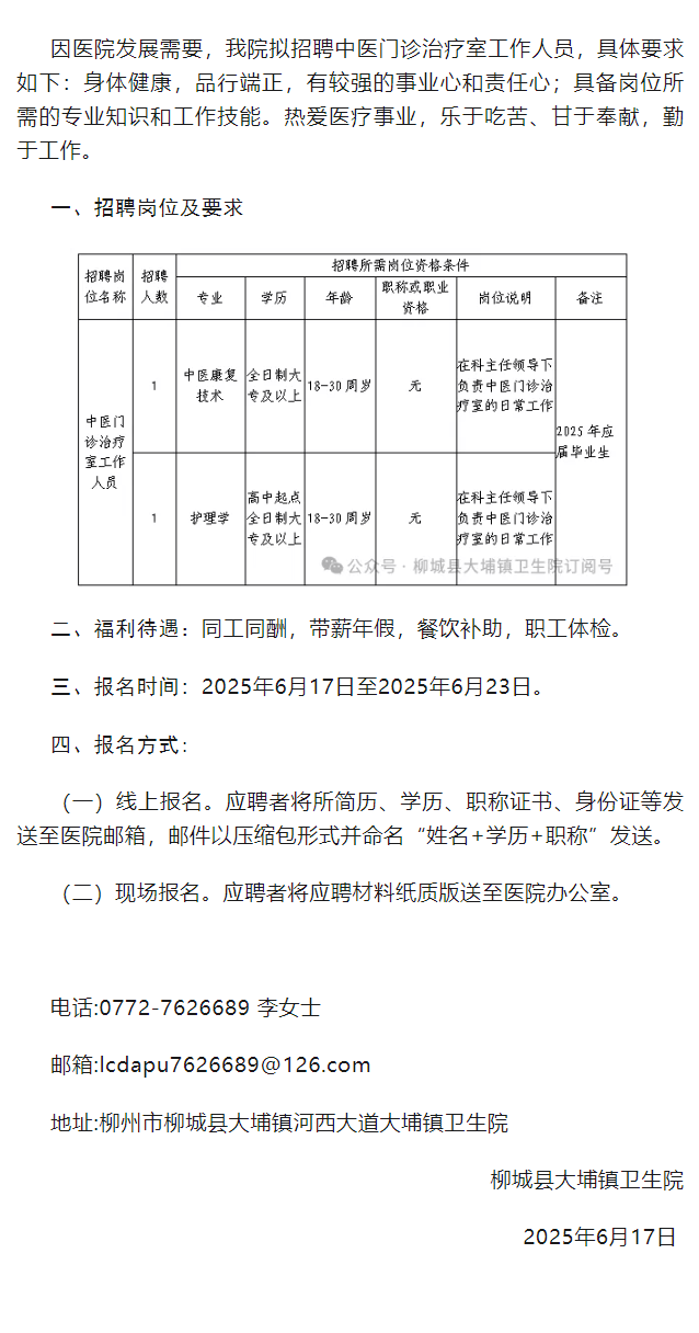 柳城縣大埔鎮(zhèn)衛(wèi)生院中醫(yī)門診治療室工作人員招聘2人