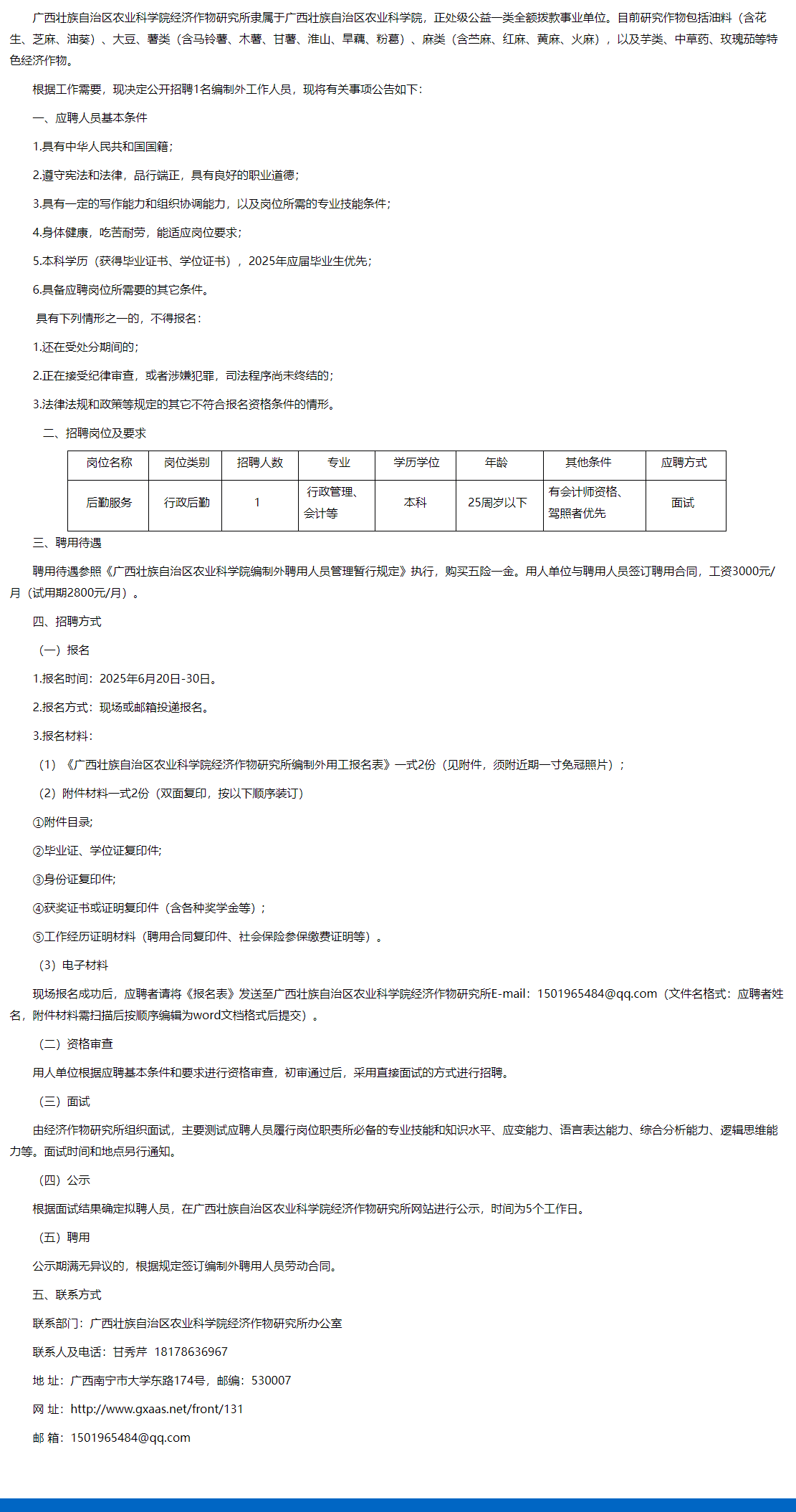 2025年廣西壯族自治區(qū)農(nóng)業(yè)科學(xué)院經(jīng)濟作物研究所招聘編制外工作人員1人