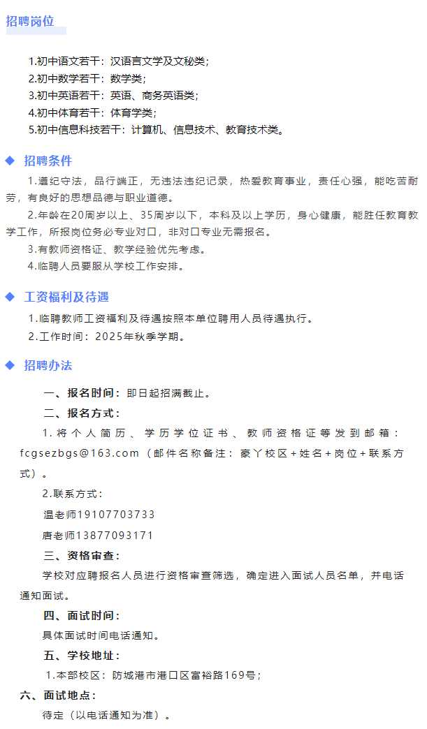 原文標題:防城港市第二中學(豪丫校區(qū))2025年秋季學期臨聘教師招聘公告