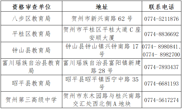 詳見已發(fā)布的《2025年賀州市中小學(xué)(幼兒園)教師公開招聘簡章》附件1《2025年賀州市中小學(xué)(幼兒園)教師公開招聘崗位計劃表》,資格審查單位信息如下表: