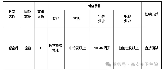 來(lái)賓市興賓區(qū)高安鄉(xiāng)衛(wèi)生院是一家集醫(yī)療、預(yù)防保健、康復(fù)醫(yī)療于一體的國(guó)家公立基層醫(yī)療機(jī)構(gòu),現(xiàn)有職工45人,服務(wù)人口約2萬(wàn)人。因工作需要,我院擬向社會(huì)公開(kāi)招聘編制限額外檢驗(yàn)科人員1名,現(xiàn)將有關(guān)招聘事項(xiàng)公告如下: