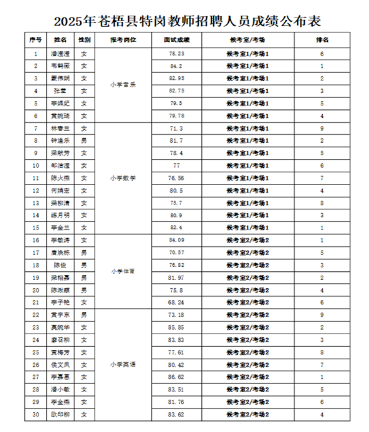 2025年蒼梧縣特崗教師招聘人員面試成績(jī)公布