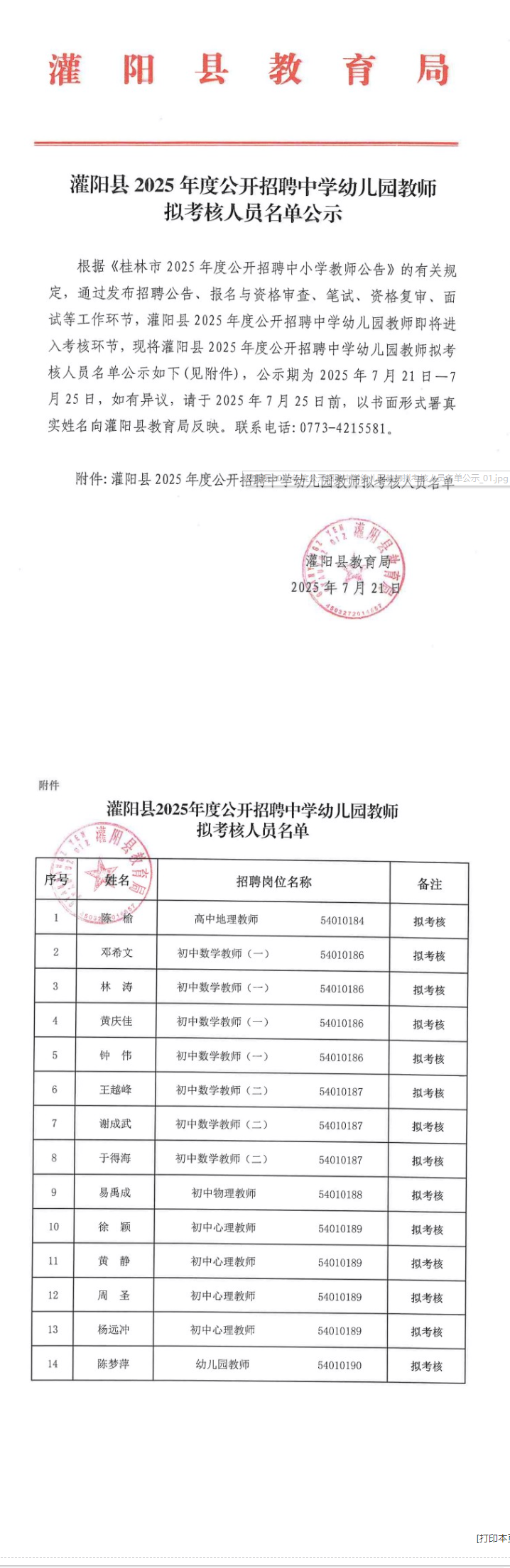 灌陽縣2025年度公開招聘中學(xué)幼兒園教師擬考核人員名單公示