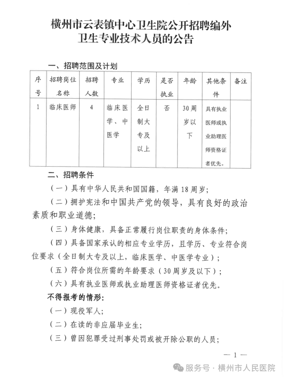 2025年橫州市云表鎮(zhèn)中心衛(wèi)生院公開招聘編外衛(wèi)生專業(yè)技術人員的公告