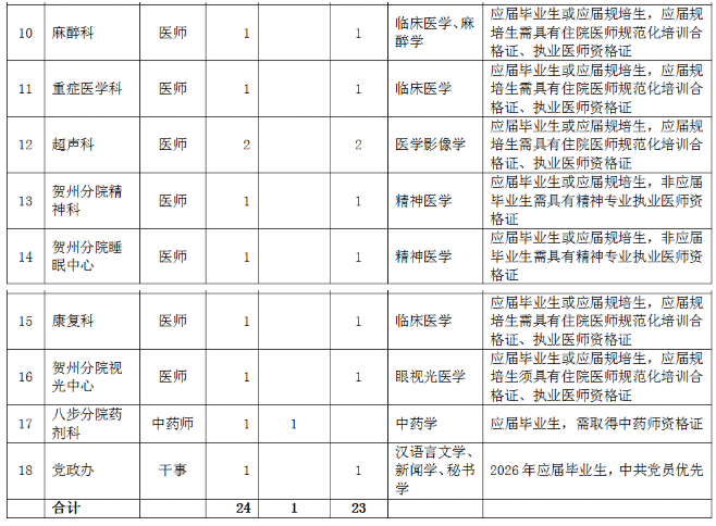 (應(yīng)聘報(bào)名二維碼)同時(shí),按以下要求提供個(gè)人應(yīng)聘材料(電子版)發(fā)電子郵箱:gdyy2817726@163.com(郵件主題請(qǐng)標(biāo)明:“姓名+賀州兩分院”字樣)。應(yīng)屆畢業(yè)生:個(gè)人簡(jiǎn)歷、身份證、就業(yè)推薦表、成績(jī)單、各種獎(jiǎng)項(xiàng)獎(jiǎng)勵(lì)證書、外語(yǔ)等級(jí)證書等。非應(yīng)屆畢業(yè)生:個(gè)人簡(jiǎn)歷、身份證、畢業(yè)證、畢業(yè)證備案登記表、學(xué)位證、學(xué)位證備案登記表、職稱證、執(zhí)業(yè)證、住院醫(yī)師規(guī)范化培訓(xùn)合格證、工作證明等。報(bào)名時(shí)所提交的申請(qǐng)材料必須真實(shí)、準(zhǔn)確,因報(bào)名時(shí)提交的申請(qǐng)材料不真實(shí)、不完整或錯(cuò)誤填寫報(bào)名信息,造成資格審查、面試資格審查不通過(guò)的,后果由報(bào)名人員自行承擔(dān)。(2)資格審核。人事科依據(jù)招聘公告和用人需求規(guī)定的資格條件對(duì)應(yīng)聘人員簡(jiǎn)歷進(jìn)行收集和資格初步審查,經(jīng)招聘工作領(lǐng)導(dǎo)小組審核后,確定符合崗位條件報(bào)名人員名單,由醫(yī)院人事科電話或短信通知符合條件人員。(3)考核??己斯P試和面試由人事科負(fù)責(zé)組織實(shí)施,協(xié)助部門為醫(yī)務(wù)部、護(hù)理部、科教科以及用人科室,紀(jì)律監(jiān)督部門為監(jiān)察室。逾期未參加則視為自愿放棄。(4)試工。通過(guò)考核的非應(yīng)屆畢業(yè)應(yīng)聘人員,須到醫(yī)院試工5天。試工不通過(guò),不予聘用。(5)體檢。體檢工作由廣西壯族自治區(qū)桂東人民醫(yī)院按照有關(guān)規(guī)定統(tǒng)一組織。體檢標(biāo)準(zhǔn)參照《廣西壯族自治區(qū)事業(yè)單位公開(kāi)招聘人員體檢通用標(biāo)準(zhǔn)(試行)》《廣西壯族自治區(qū)事業(yè)單位公開(kāi)招聘人員體檢操作手冊(cè)(試行)》執(zhí)行。體檢不合格或隱瞞真實(shí)情況致使體檢結(jié)果失真的,不予聘用。因體檢不合格空缺崗位的,將按考核的綜合成績(jī),從高到低,順位補(bǔ)充體檢人員。(6)公示和聘用。對(duì)擬聘非應(yīng)屆畢業(yè)應(yīng)聘者在全院范圍內(nèi)進(jìn)行公示,公示期為5個(gè)工作日,公示期滿無(wú)異議按程序辦理聘用手續(xù)。對(duì)公示有異議,經(jīng)核實(shí)影響聘用的,取消其聘用資格;對(duì)反映問(wèn)題難以核實(shí)的暫緩聘用,待核實(shí)清楚后按有關(guān)規(guī)定辦理。