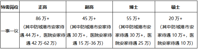 注:市級人才待遇需要符合《防城港國際醫(yī)學(xué)開放試驗區(qū)醫(yī)療衛(wèi)生高層次人才引進(jìn)培養(yǎng)實施辦法(試行)》或《防城港市黨政機關(guān)和事業(yè)單位人才待遇保障暫行辦法》辦法中引進(jìn)條件方可落實。