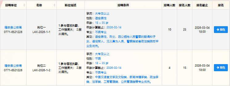 附件:1.隆安縣公安局2026年度公開招聘警務輔助人員職位計劃表