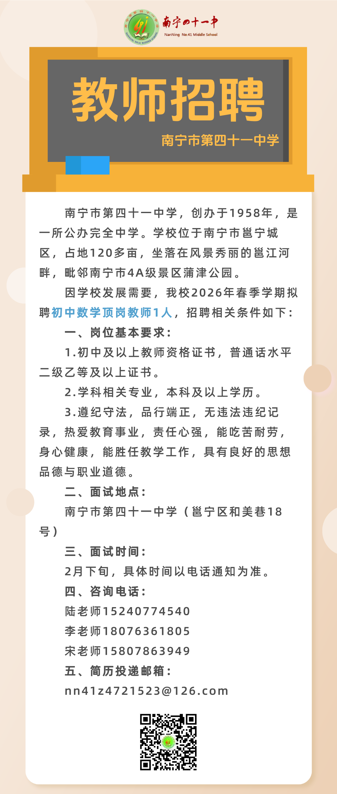 原文標(biāo)題:2026年春季學(xué)期南寧市第四十一中學(xué)關(guān)于公開(kāi)招聘頂崗教師的啟事